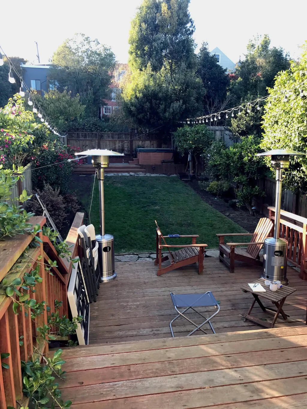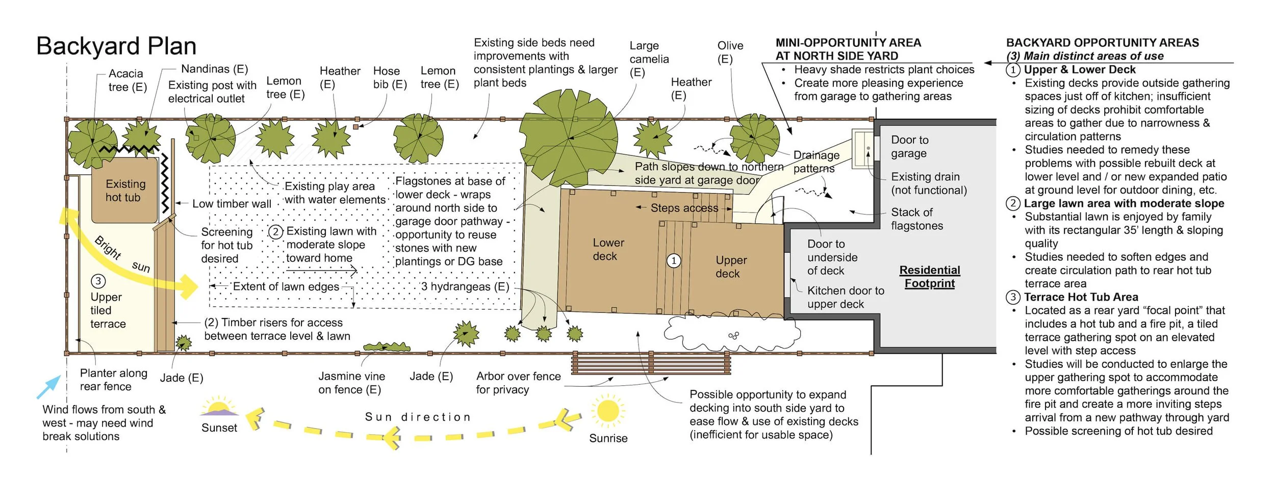 A long and narrow backyard with a disconnected collection of existing uses. The client desired a design re-do; essentially expanding on some of the uses for better efficiency, re-designing the backdoor arrival deck and steps, and creating a more organized open turf area, with a connective pathway and new planting beds along the perimeters. A new outdoor dining area, with new pavers, was added at the ground level for easy yard access, and the raised hot tub level was increased in size to accommodate a custom circular, stone-faced fire pit, with additional seating.