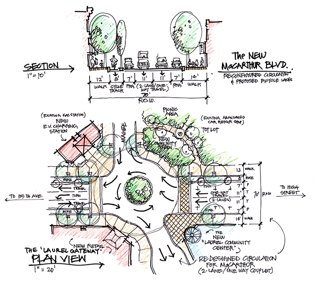 A re-visioning exercise for "The Laurel" commercial district along MacArthur Boulevard near I-580 in Oakland, CA. This busy, mostly single-use retail strip between High Street and 35th Avenue is a perfect candidate for targeted mixed-use redevelopment, and smart solutions for unsafe traffic circulation. Currently a 4-lane, two-way arterial, MacArthur handles a high number of trips, thereby fueling the success of the retail district. But unfortunately, the high traffic counts and narrow R.OW. make for a pedestrian and bicycle un-friendly realm. "The Laurel" stands to capitalize on a great opportunity comprised of new circulation patterns, targeted redevelopment nodes, and added public open spaces.
