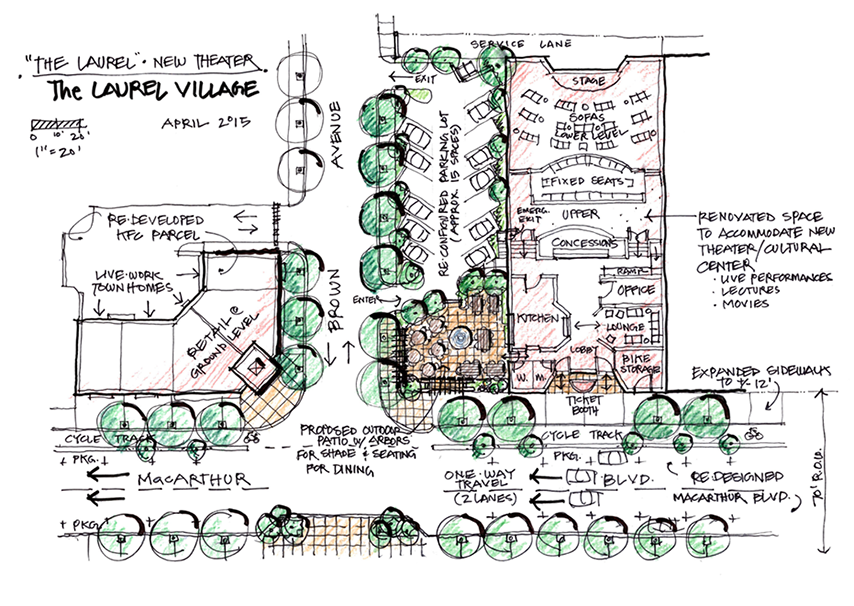 The Laurel Theater: A Targeted Redevelopment Node at Brown Avenue. The existing structure was once a movie theater, and is once again, ideal for adaptive re-use. A cultural center for live performances, lectures, and movies, with an outdoor gathering space at the corner, this re-envisioned node will help activate and enliven the new mixed-use Village.
