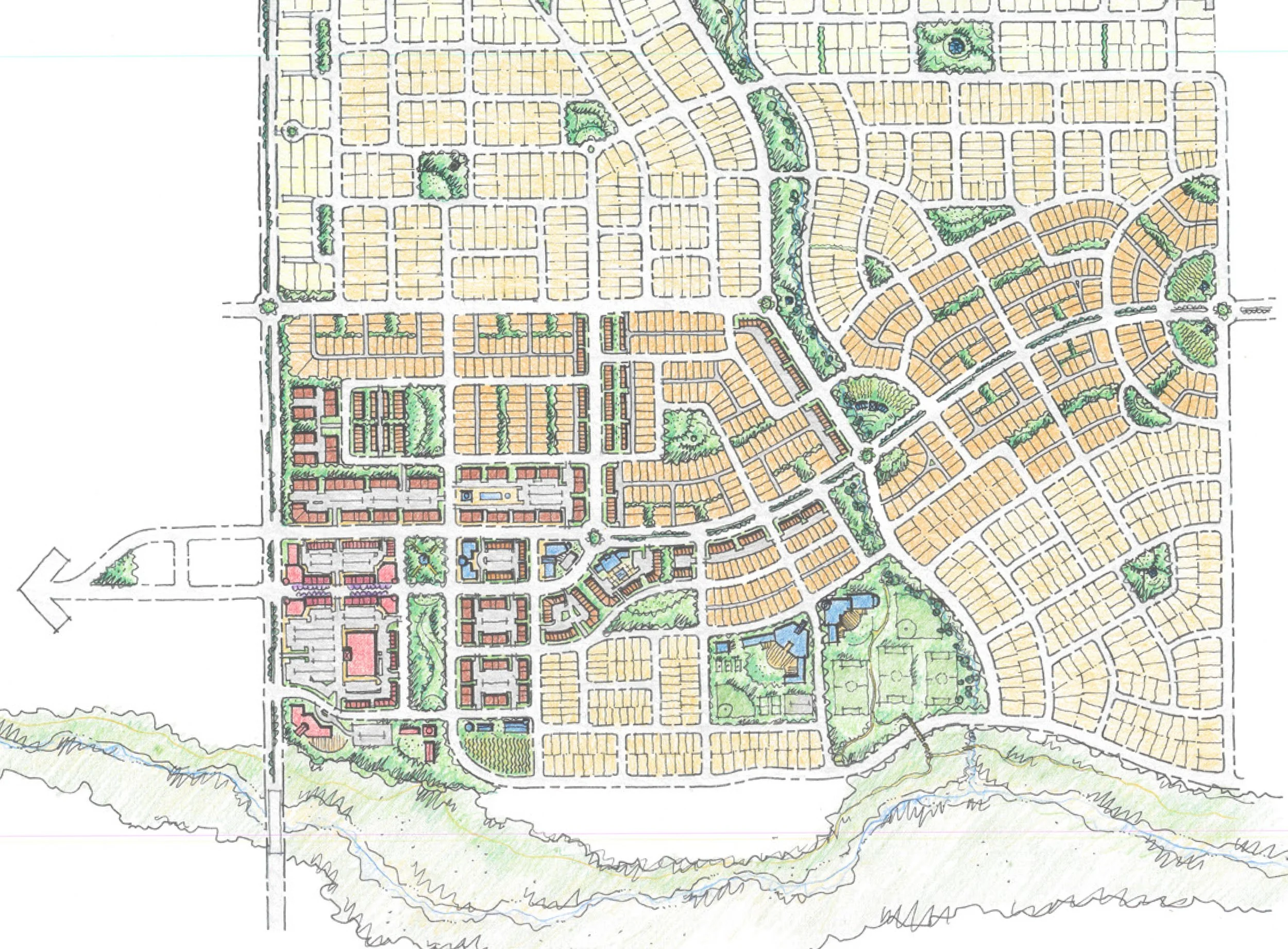 Program: 6,000 units, Village Center- 150K s.f. retail, Civic anchored Neighborhood Centers, 100+ acres open space